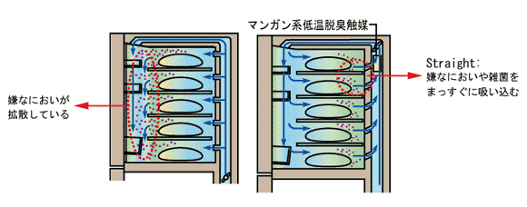 『立体吸引冷却』は、冷気とともに嫌なにおいや雑菌を背面からまっすぐに吸い込み、集中的にマンガン系「低温脱臭触媒」で強力かつスピーディーに脱臭します。