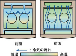 従来の冷却方式では、冷気の渦流が発生しやすく、食品を詰め込み過ぎると、食品の冷えムラが起こりやすくなっていました。