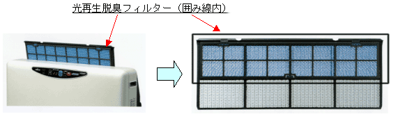 「光再生脱臭フィルター」は、光触媒機能を有する酸化チタンと吸着剤とを複合化してシート化したもので、タバコのニオイ、ペット臭、ホルムアルデヒドなどのニオイ分子を吸着・分解(注3)し、より「快適・清潔」暖房を実現します。