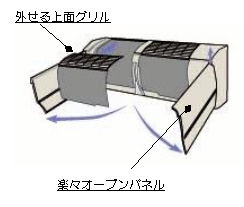 - カンタン清掃で省エネに役立つ「楽々オープンパネル」(観音開き)、「外せる上面グリル」