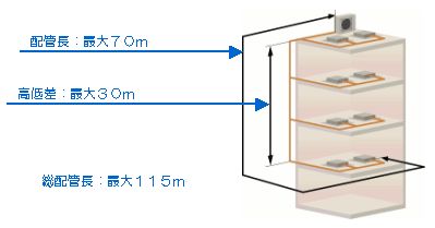 海外の高級住宅や商業ビルの設置に幅広く対応するシステムとして、配管長:最大70m、高低差:最大30m、総配管長:最大115mの配管システムを用意しました。
