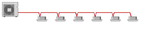 従来の配線方式では、室外機と室内機を一対一で接続するので、室内機の台数分の接続が必要で、配線の煩雑さや設置工事での効率性に課題がありました。当社独自の渡り配線方式では、これらの課題を解決すべく、室外機と各室内機を一系統で配線することにより、配線が少なくなり工事性の効率化を実現するとともに、メンテナンス性の向上を図りました。