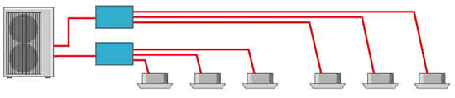 従来の配管方式では室内機の台数にあわせた配管が必要であったのに対して、新商品では当社独自の配管分流方式を採用し、ジョイント接続をすることで配管スペースの省スペ―ス化、工事性の効率化を図りました。