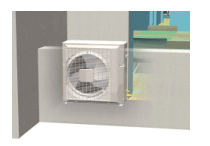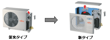 従来タイプの室外機は側板しか取り外しができず、メンテナンス時に制約がありました。新開発の室外機は、室外機天板を簡単に取り外せる構造とし、集合住宅などの窓下設置時において上部からのメンテナンス性の向上を図りました。