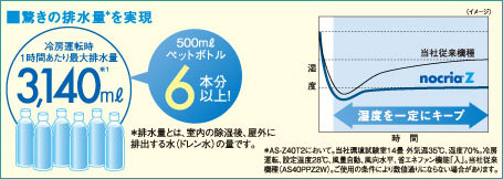 冷房運転時1時間あたりの最大排水量3,140ミリリットル(※1)。500ミリリットルペットボトル6本以上。