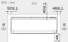 据付の際、壁に面している側は、メンテナンスのことを考えて左側は52mm以上、右側は48mm以上のスペースを確保してください。