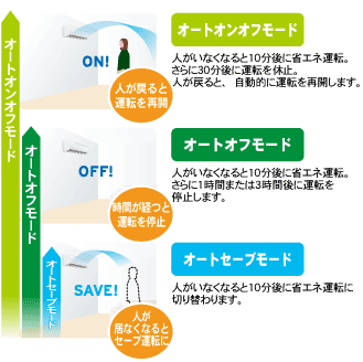 人感センサーで人の不在を検知すると10分後に省エネ運転、さらに1時間または3時間後に運転を停止します。