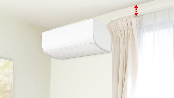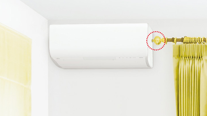 エアコンの設置スペースは狭く、装飾カーテンポールの増加により、天井下への設置も困難です。