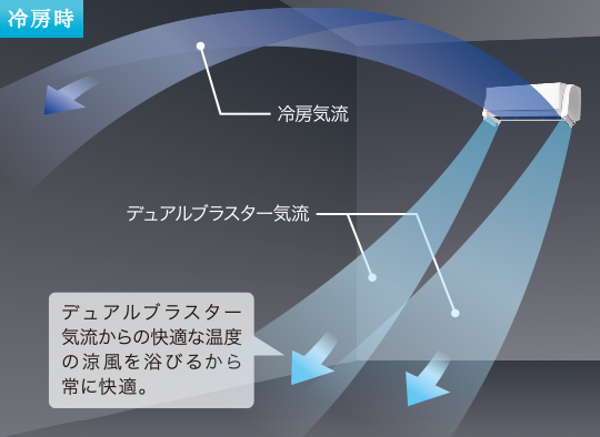 冷風は身体に当てずに天井へ、「デュアルブラスター」のやさしい気流が身体を包み込んで体感温度を下げます。