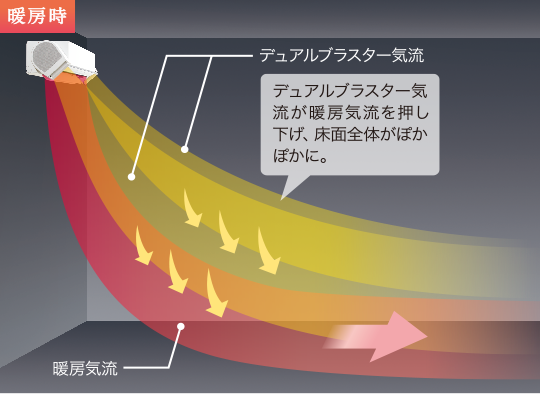 「デュアルブラスター」気流が天井に吹き上がりがちな暖房気流を上から押さえます。