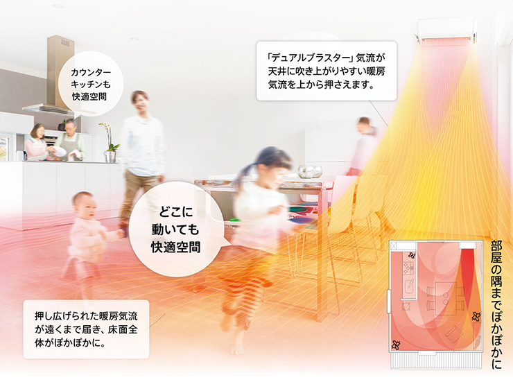「デュアルブラスター」の気流が暖気の吹き上がりをおさえて床面に広げ、足元からぽかぽかに。
