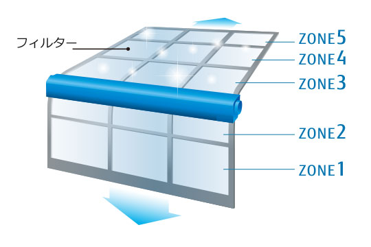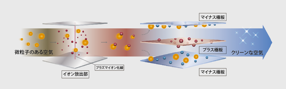微粒子をプラズマイオンでプラスに帯電させ、マイナスの電極板で強力に吸着。フィルター方式のように目を細かくする必要がないため、目詰まりによる性能の低下が抑えられ、高い集じん力が持続します。(注2)