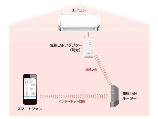 スマートフォンをリモコンにして、外出先からエアコンを操作。 専用アプリを使いエアコンをスマートフォンと接続。外出先からのオン/オフはもちろん、運転状況の確認や運転内容の変更などが、いつでもどこでもできるようになります。