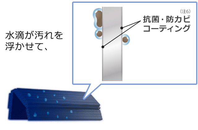 エアコン内部の熱交換器に抗菌・防カビ(注6)コーティングを施し、熱交換器のカビ菌、細菌の繁殖を抑制します。 冷房時と除湿時に発生した水で、熱交換器を自動洗浄します。(ホコリや油汚れの多い環境でのご使用時には、熱交換器の洗浄が必要となる場合があります。)