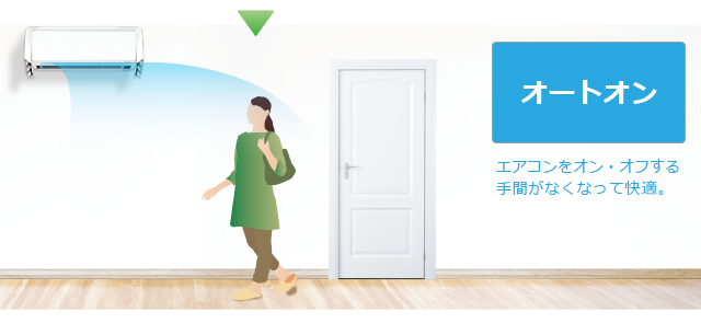 オートオンオフモードなら、人が戻ったタイミングで自動的に運転を再開。リモコンのスイッチを押す手間を省きます。