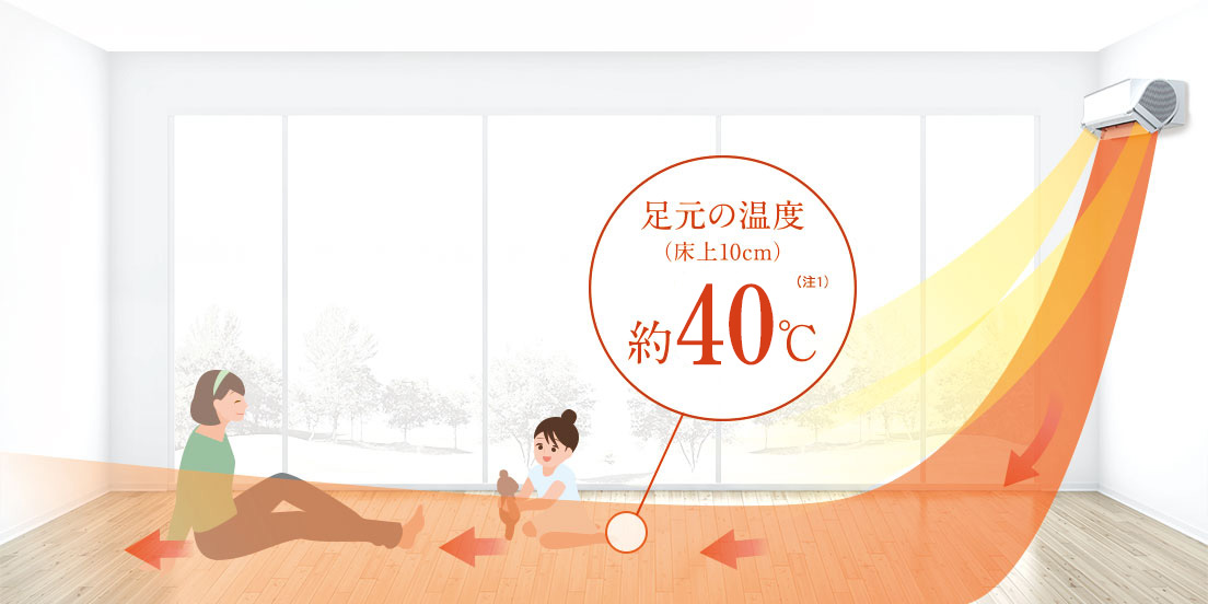 お部屋が暖まり、温風が弱まった後も「デュアルブラスター」の気流で暖気を押し広げ足元からしっかり暖めます。