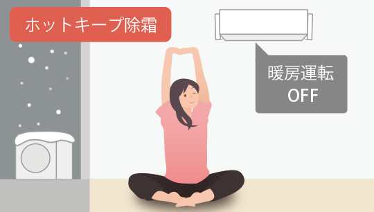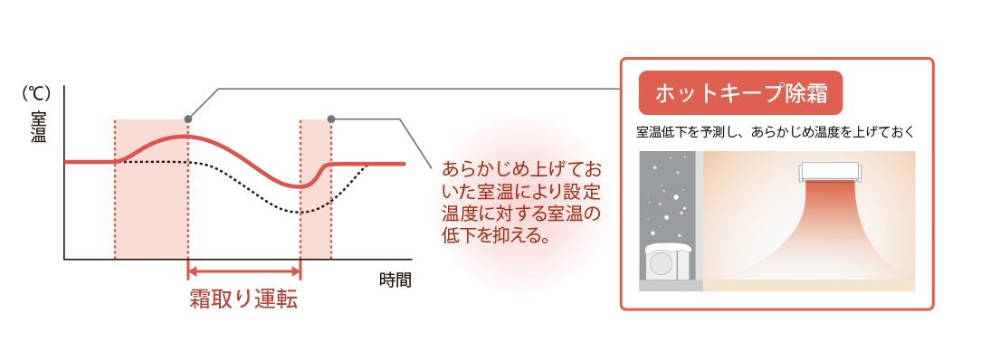 室外機についた霜を溶かすため、一時的に暖房をストップさせる霜取り運転。 ホットキープ除霜なら霜取り運転に入る前にあらかじめ強めにお部屋を暖めておくため、室温の低下を抑えられてずっと快適です。