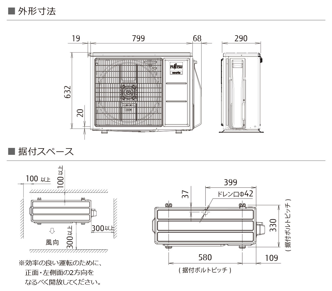 効率の良い運転のために、正面・背面・右側面・左側面のうち2方向を開放してください。やむをえず吸入口および吹出口に壁などの障害物がある場所に室外ユニットを据え付ける場合は、左側面は 100mm以上、背面は 100mm以上、右側面は 300mm以上、正面は 300mm以上 のスペースを確保してください。