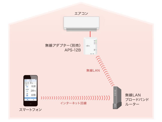 スマートフォンをリモコンにして、外出先からエアコンを操作。 専用アプリを使いエアコンをスマートフォンと接続。外出先からのオン/オフはもちろん、運転状況の確認や運転内容の変更などが、いつでもどこでもできるようになります。