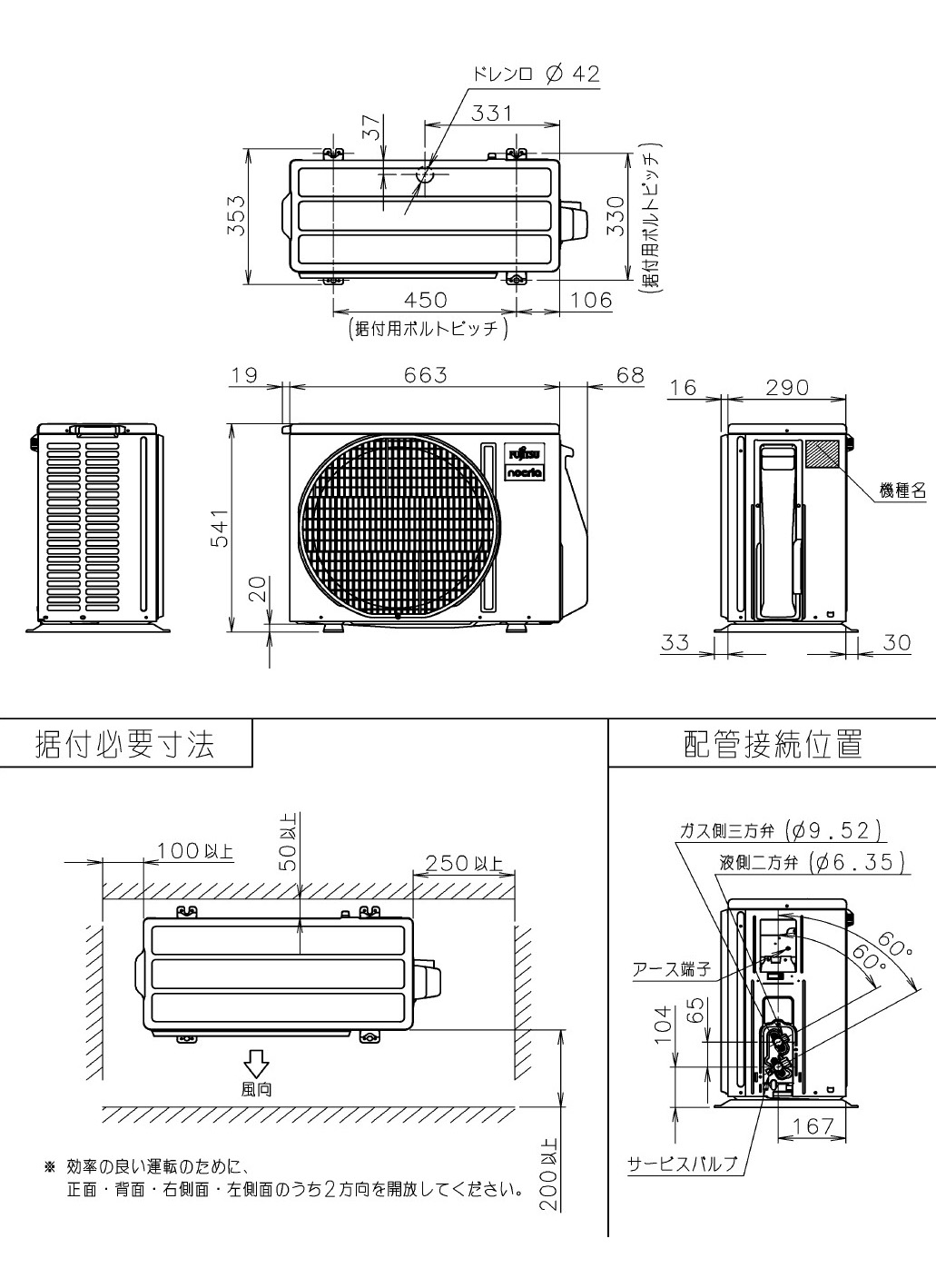 - 室外機の外形寸法はバルブカバーや固定脚を除いた寸法です。バルブカバーや固定脚を含めた寸法は、据付スペース図をご確認ください。