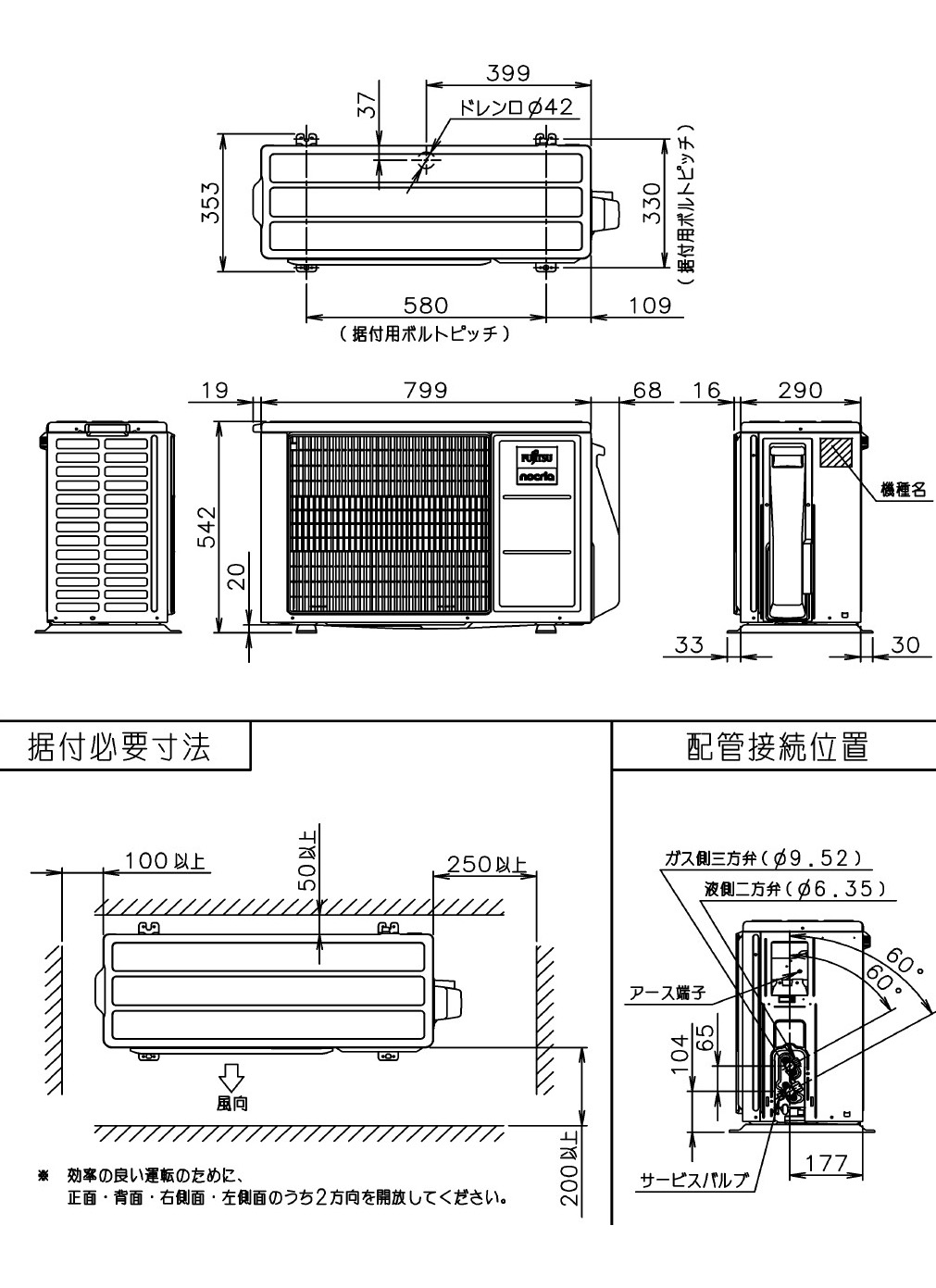 - 室外機の外形寸法はバルブカバーや固定脚を除いた寸法です。バルブカバーや固定脚を含めた寸法は、据付スペース図をご確認ください。