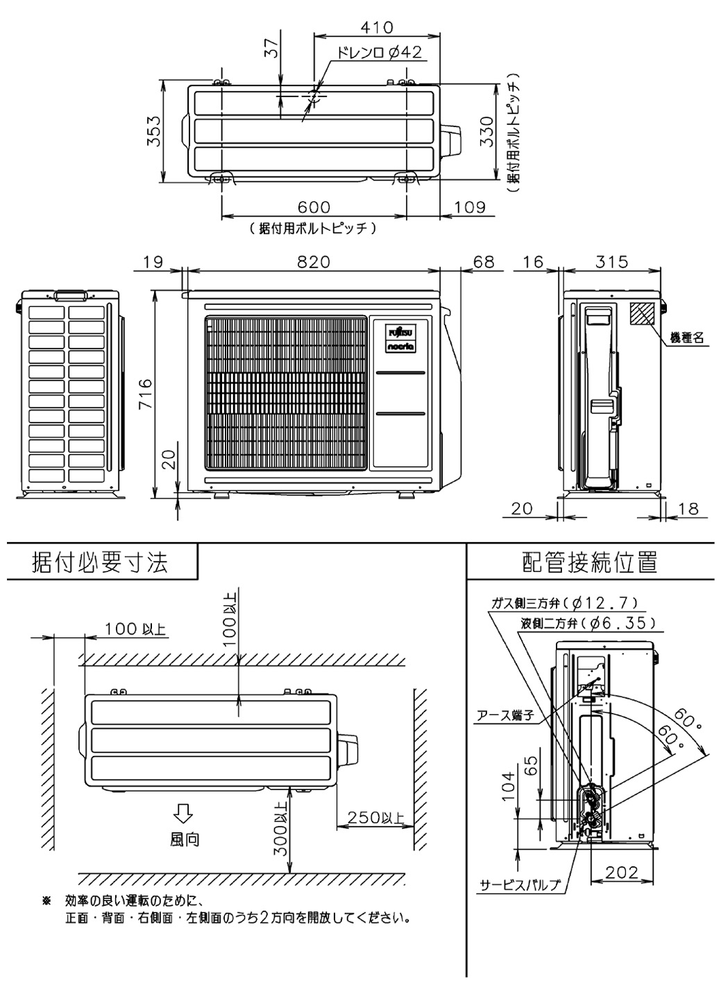 - 室外機の外形寸法はバルブカバーや固定脚を除いた寸法です。バルブカバーや固定脚を含めた寸法は、据付スペース図をご確認ください。