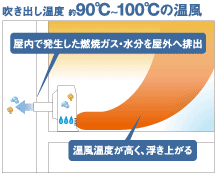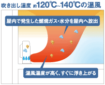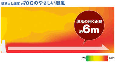 熱くなりすぎない約70°Cの温風は、熱の浮き上がりと空気の乾燥を抑えて、やさしく暖めます。また、室内の空気だけを循環させるので、カビの原因となる結露を防ぎます。