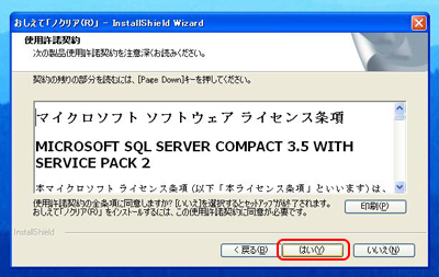 - 『マイクロソフト ソフトウェア ライセンス(Microsoft® SQL Server Compact)使用許諾契』が表示されたら、条項の内容を確認し、同意する場合は【はい(Y)】をクリックします。