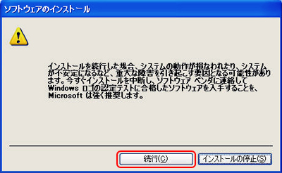 - インストールの最中に Windows ロゴテストに関する画面が表示された場合は、【続行(C)】を押してインストールを進めてください。