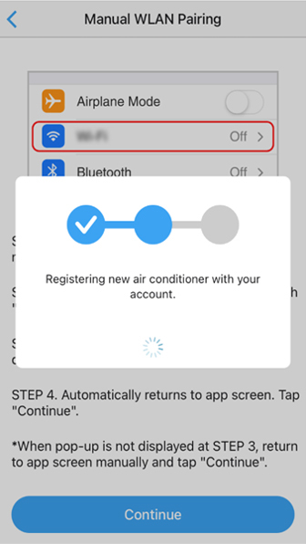 Meddelandet ”Registrerar ny luftkonditionering för ditt konto” [Registering new air conditioner with your account] visas på skärmen.