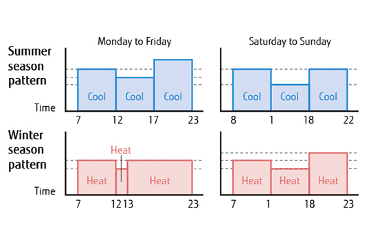 Up to 4 on/off settings can be programmed per day. 2 weekly patterns can be set, one for the cooling season and the other for the heating season.