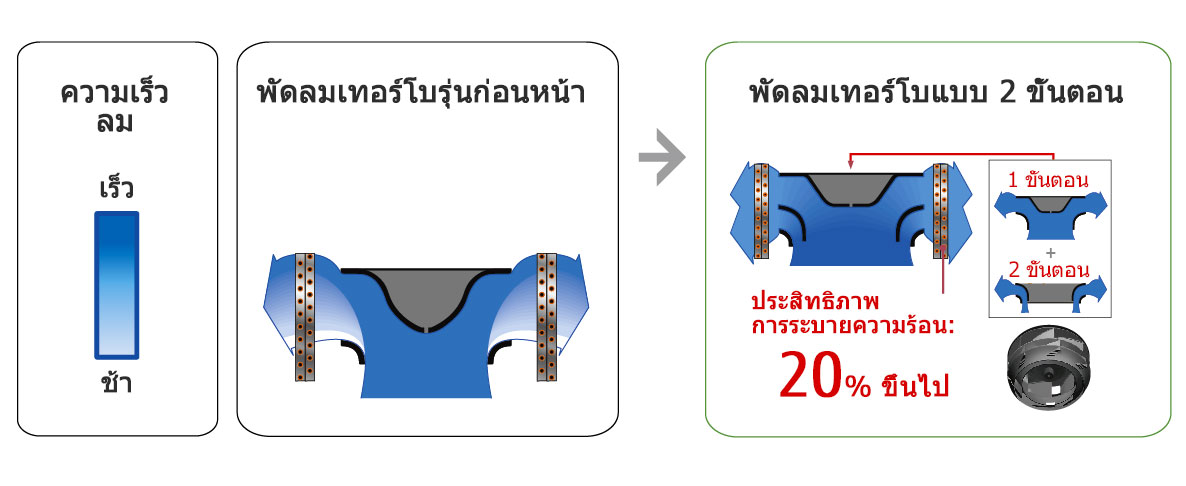 สามารถมีการกระจายลมที่สม่ำเสมอผ่านแผงระบายความร้อนด้วยพัดลมเทอร์โบแบบ 2 ขั้นตอนตัวใหม่ ซึ่งจะสร้างการไหลเวียนของลมแยกเป็นสองทาง