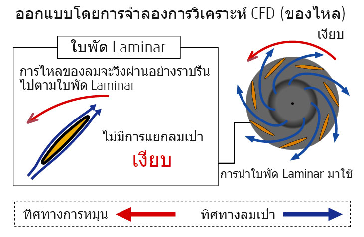 การเพิ่มประสิทธิภาพของใบพัด (ใบพัด Laminar) และจำนวนใบพัด (7 ใบต่อชิ้น)