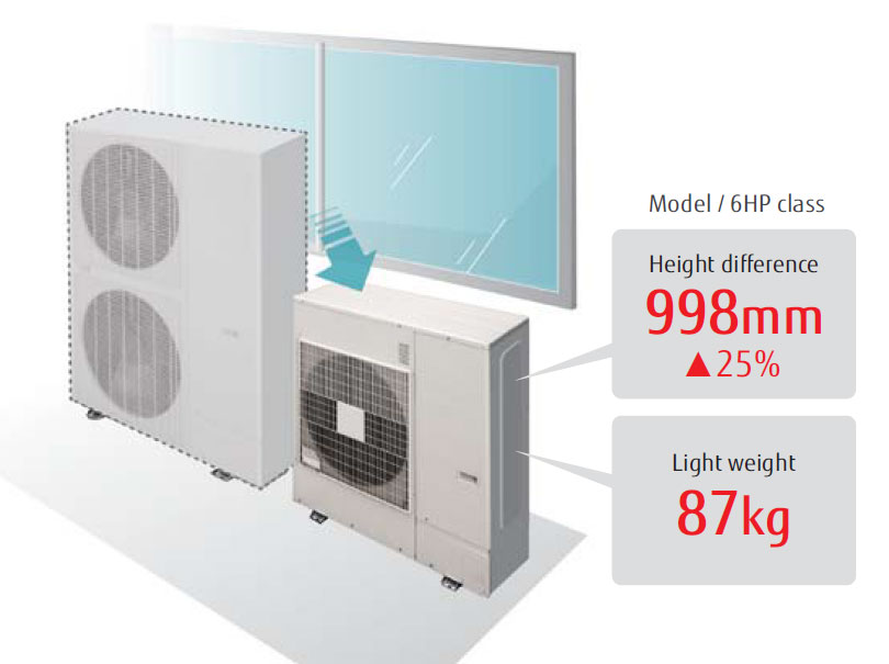 รุ่นนี้มีขนาดกะทัดรัดกว่ายูนิตภายนอกที่เทียบเคียง 6HP ทั่วไปมาก แม้จะติดตั้งที่ระเบียงก็พอดีกับความสูงของรั้ว ขนาดกะทัดรัดที่มีความสูงน้อยกว่า 1 เมตรช่วยให้สามารถติดตั้งใต้หน้าต่างและในพื้นที่แคบได้