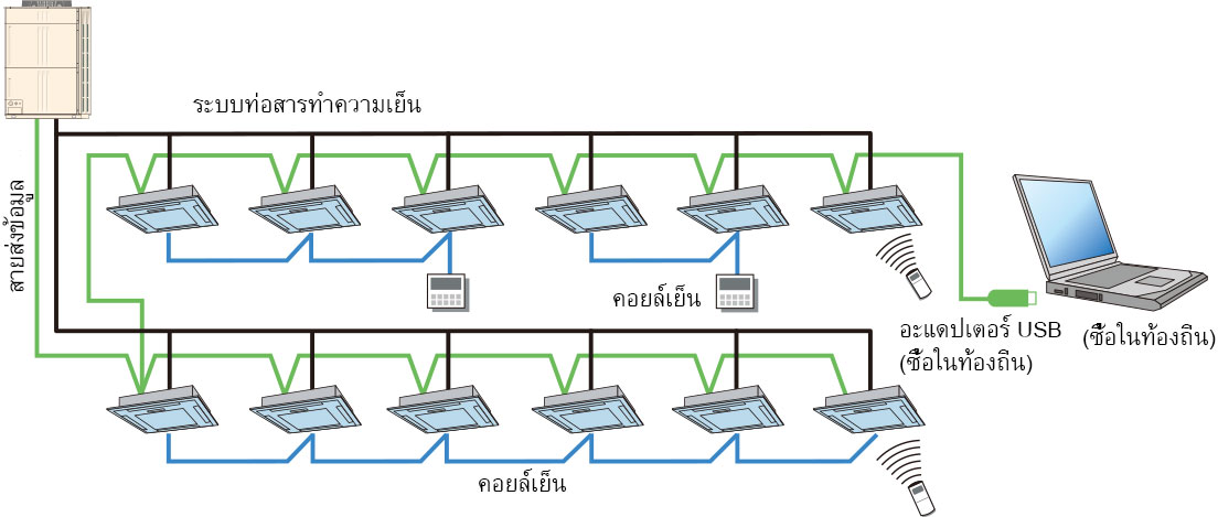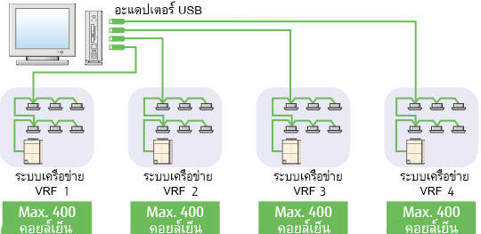 ใช้อะแดปเตอร์ USB ได้ (สูงสุด 4 อะแดปเตอร์ต่อพีซี) ตรวจสอบคอยล์เย็นได้สูงสุด 1,600 เครื่อง เหมาะสำหรับอาคารหรือโรงแรมขนาดใหญ่