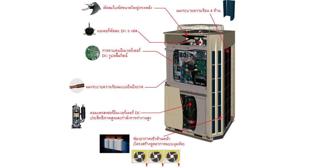 ความยืดหยุ่นในการออกแบบสูงตอบสนองความต้องการอันหลากหลายของระบบปรับอากาศในอาคารสูง เช่น การติดตั้งคอยล์ร้อนแบบอัดแน่นอยู่บนดาดฟ้าและการติดตั้งในแต่ละชั้นโดยการผสมผสานกำลังการทำงานสูง กำลังการทำงานการเชื่อมต่อที่เพียงพอ และดีไซน์ความดันสถิตสูง