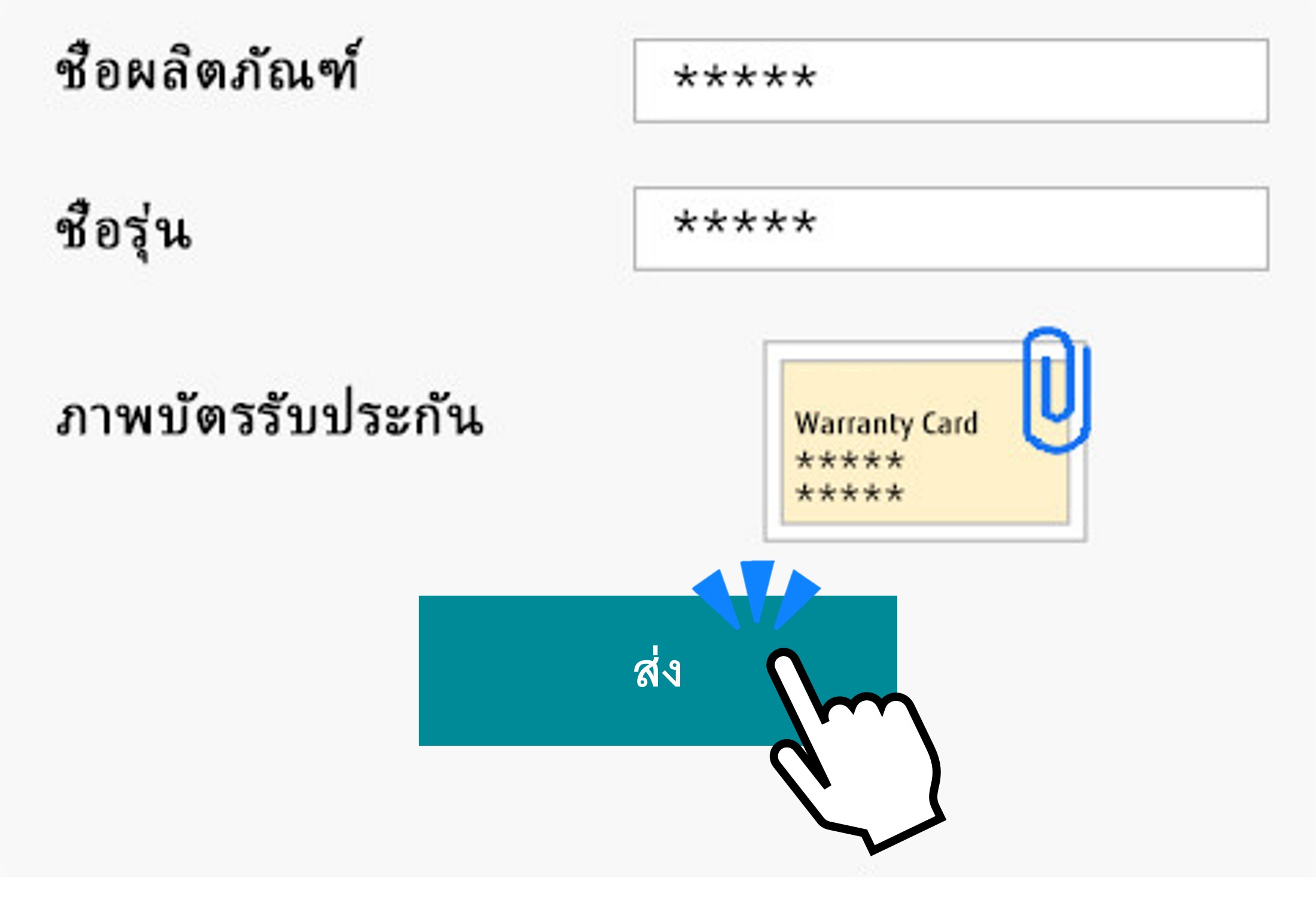 กรุณากรอกข้อมูลต่าง ๆ เช่น ข้อมูลรายละเอียดผลิตภัณฑ์, แนบไฟล์รูปภาพบัตรรับประกันจากนั้นกดปุ่มส่ง