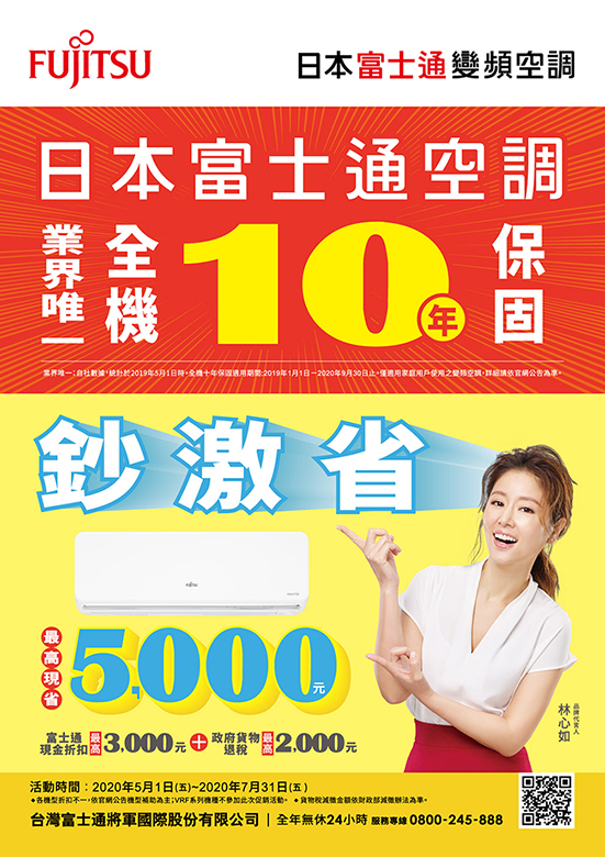 「節能鈔激省」優惠活動,2020年5月1日起至2020年7月31日,富士通現金折扣*1+政府貨物稅補助*2最高現省5,000元!