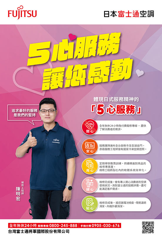 基於此,2023年台灣富士通將軍,以「服務感動年」為主題,提出「5心服務 讓您感動」,以維修前、中、後的專業服務,滿足消費者快速完修的期待。