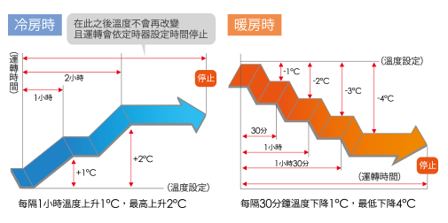 當設定睡眠模式,微電腦將自動依據運轉模式進行溫度調節,讓您整夜舒適好眠。(設定時間最長為9小時)
