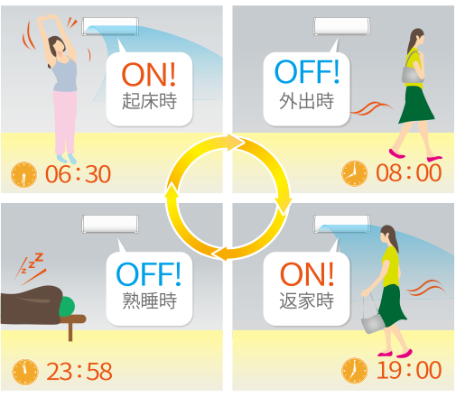 具備「定時開 / 定時關 / 定時開→關 / 定時關→開」4種設定模式,一天(24小時)皆可配合生活作息設定。