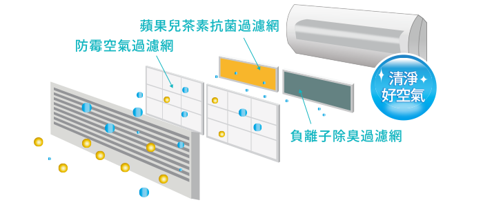把空氣中的細小灰塵及霉菌,有害的微生物質吸著在過濾網中,並經由蘋果所萃取出的酚兒茶素一一分解並進一步的抑止成長。