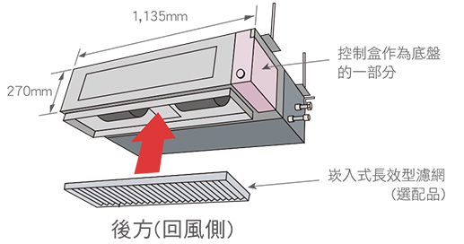 可安裝在只有27公分空間的天花板內,同時將控制盒安裝在底盤上,方便檢修