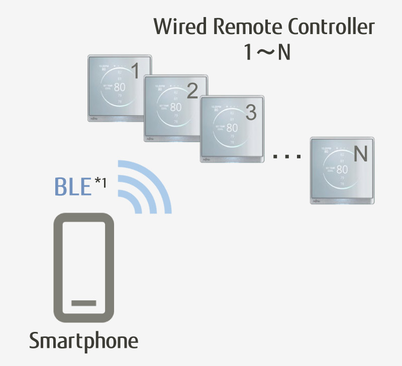 Settings are possible through the smartphone app via BLE* connection to the remote controllers. (Settings can also be adjusted manually on the remote controllers as usual.)
