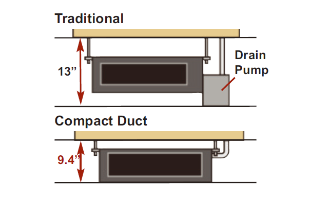 Built-in drain pump allows for installation of slim duct unit in smaller spaces than traditional units.