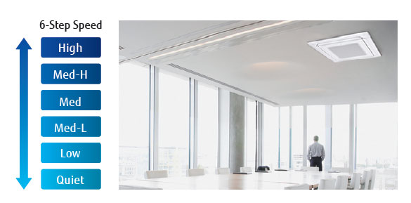 Drastic low noise is realized by new airflow structure. In addition, multistep quiet operation is available by 6-step sound level settings.