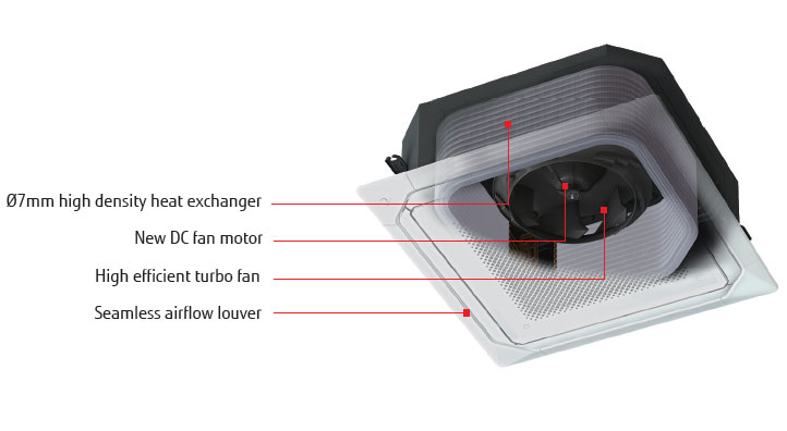 This new cassette style indoor unit achieves better air distribution using 360-degree louvers, allowing conditioned air to reach every corner of a room.