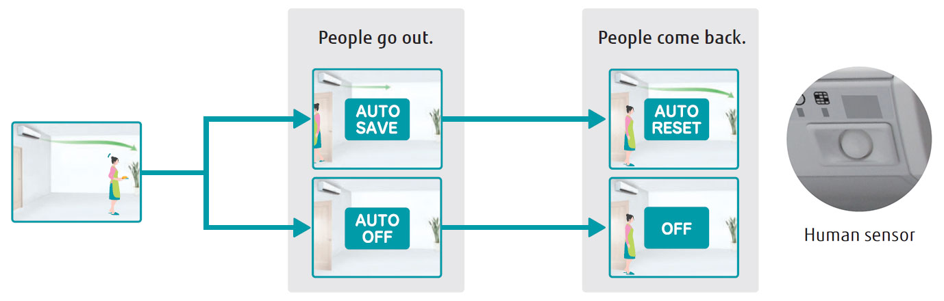 Energy saving operation starts automatically by detecting the motion of a person. 2 modes of save operation mode and stop mode can be selected.(ASUA12/14 only)