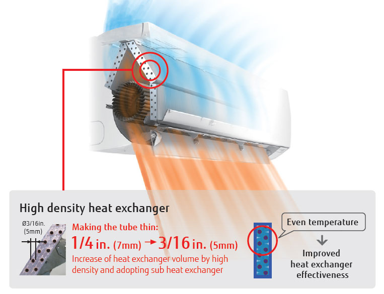 High efficiency compact design is achieved by mounting a high density and large heat exchanger.