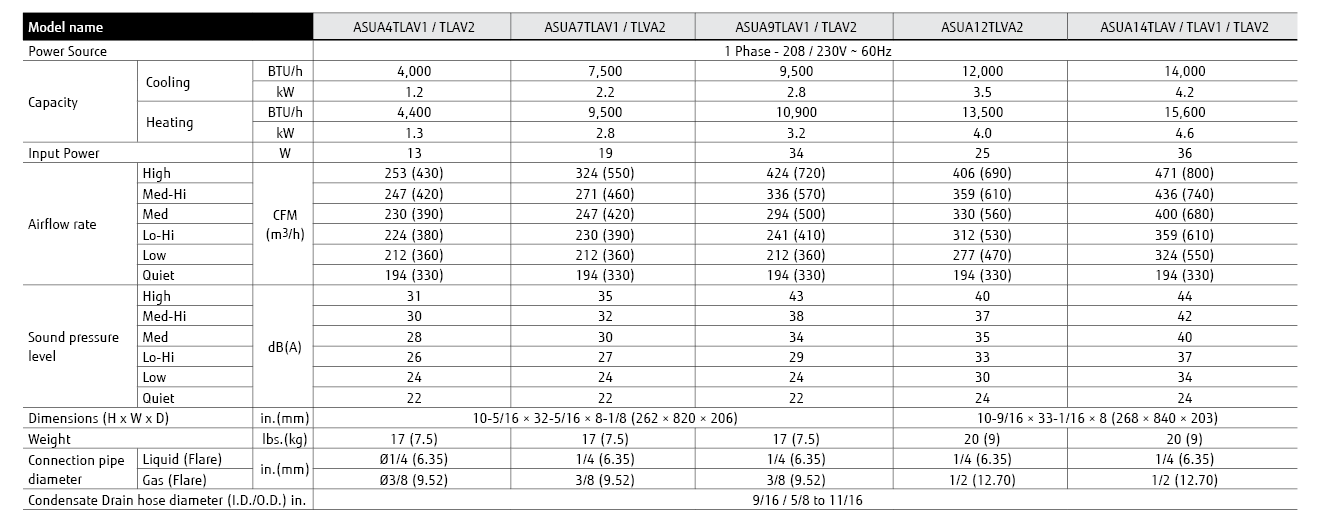 - Specifications are based on the following conditions: Built-in protective functions may limit capacity or shut off unit if unit is operated outside of unit design operating temperature ranges.